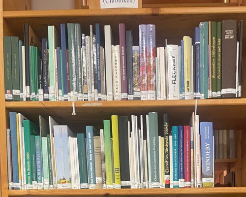 Nebenstehendes Foto: Die Dorf-Chroniksammlung in der Bücherei der Heimatgemeinschaft Eckernförde